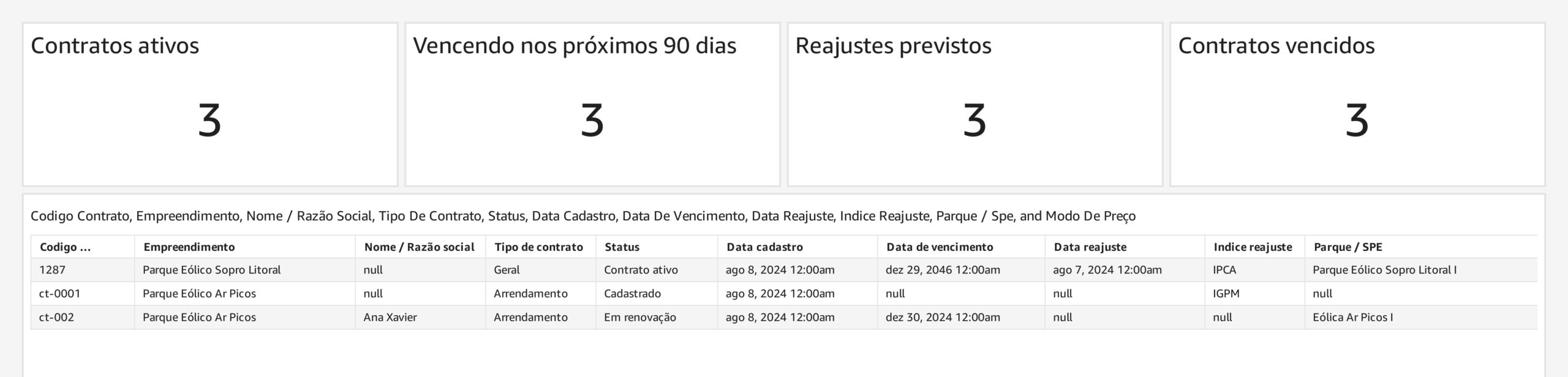 Painel de indicadores de contratos.