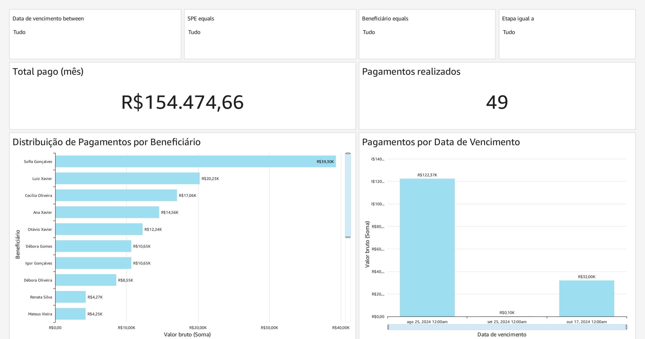 Painel de indicadores e pagamentos (dados fictícios).